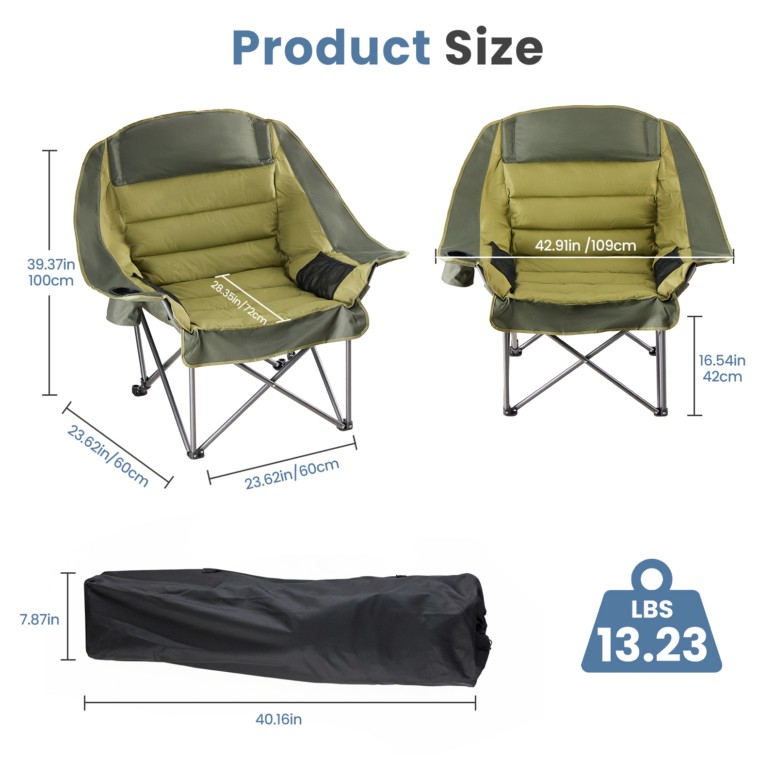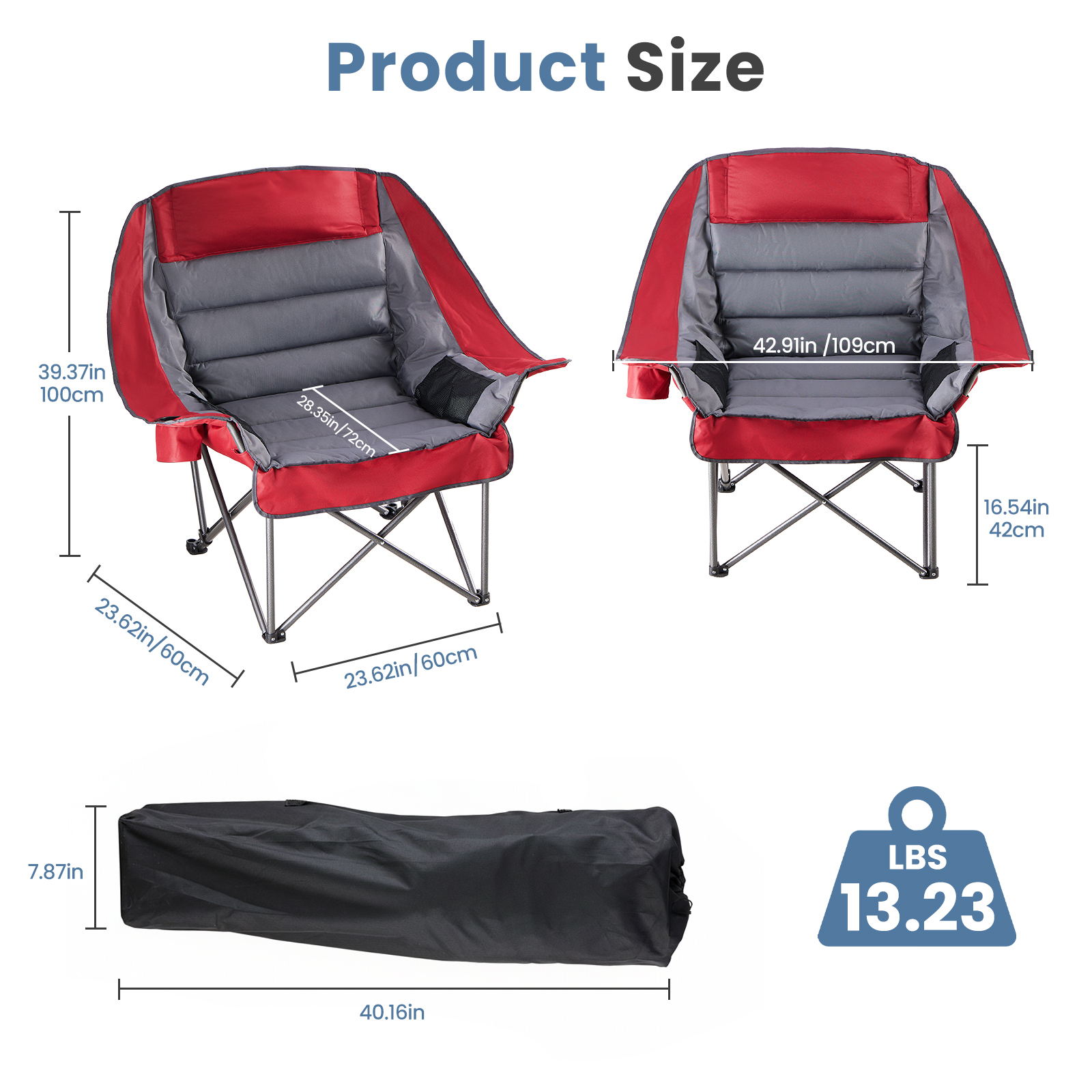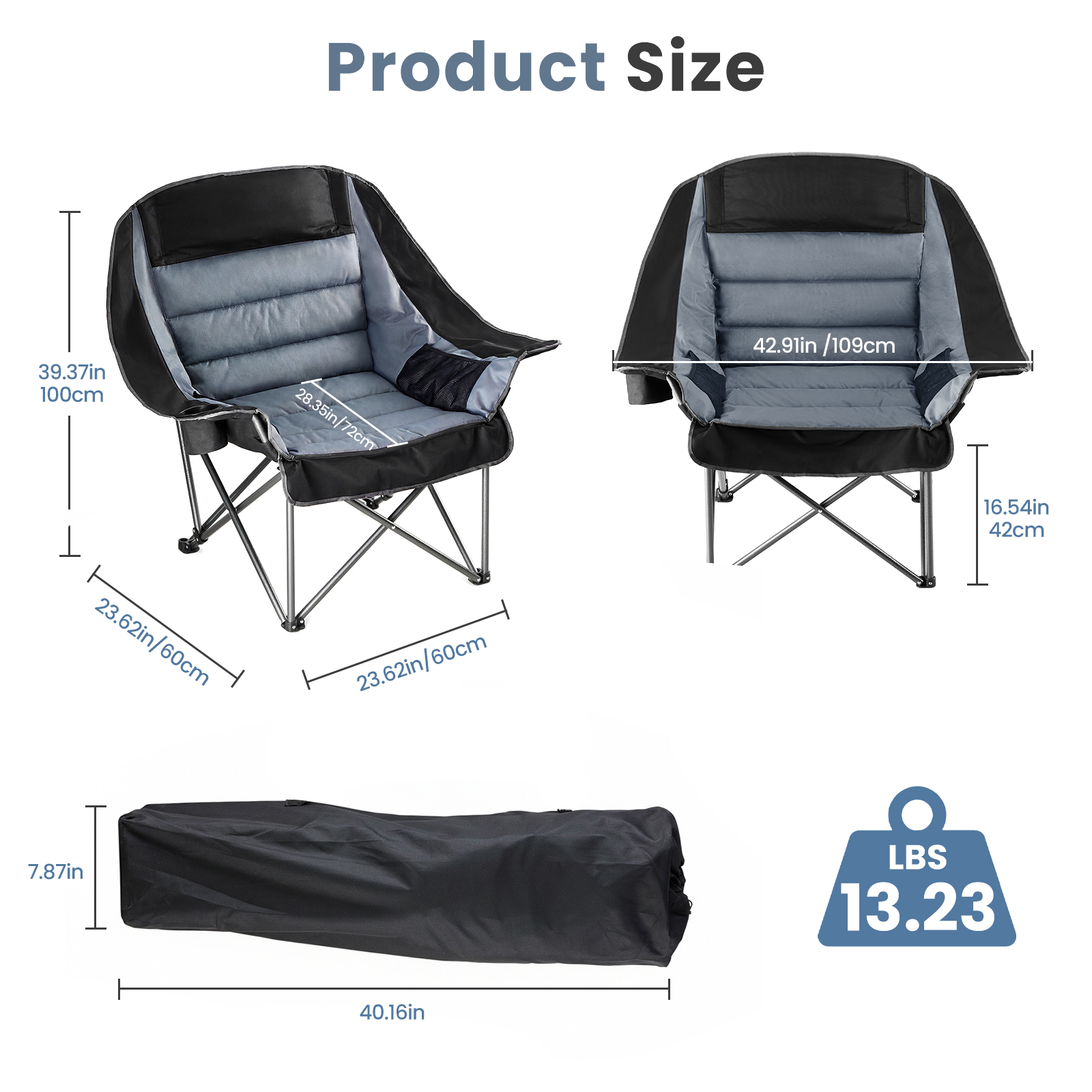 Dimensions: 38.97 inches wide × 25.19 inches deep. The space is spacious and not cramped. Made of 300x300D Oxford fabric, it provides solid support without collapsing. It can maintain a comfortable sitting posture even after prolonged sitting, and is suitable for outdoor long-term rest.